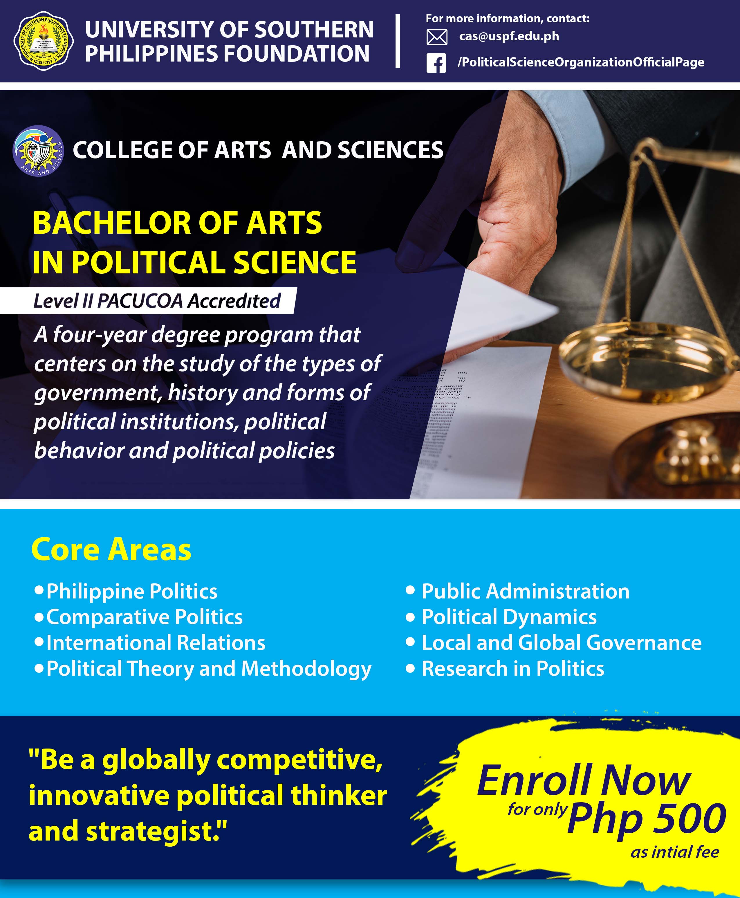 The Bachelor of Arts in Political Science is a great undergraduate degree for those who have a HUMSS background and wish to pursue a career path in government offices, non-government organizations, or private businesses.