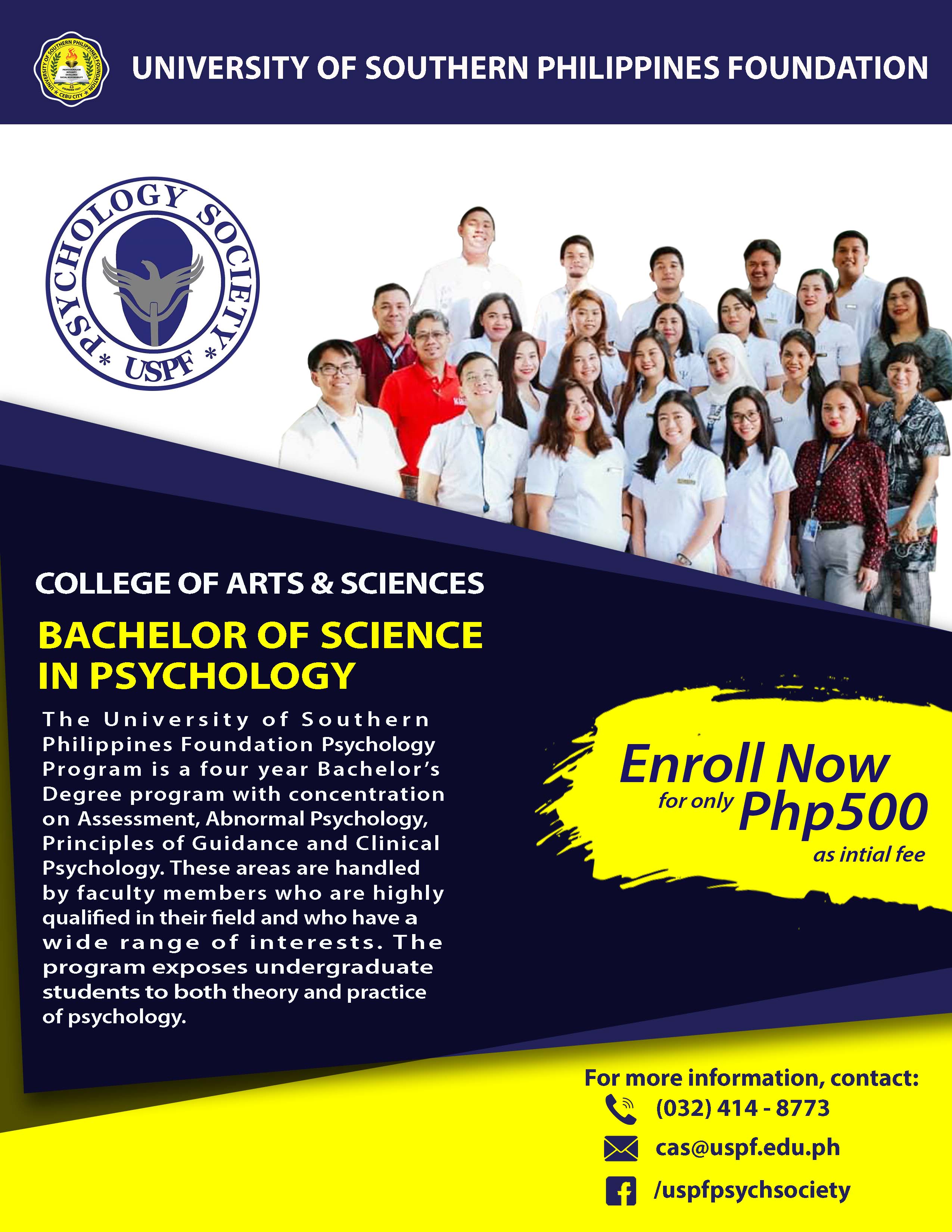 The Psychology Program of the University of Southern Philippines Foundation aims to provide students with in-depth knowledge of the discipline. The program is committed in providing a firm foundation to the Psychology majors, which will equip them in the practice of the course. The student will be able to apply their learning through internship and research.