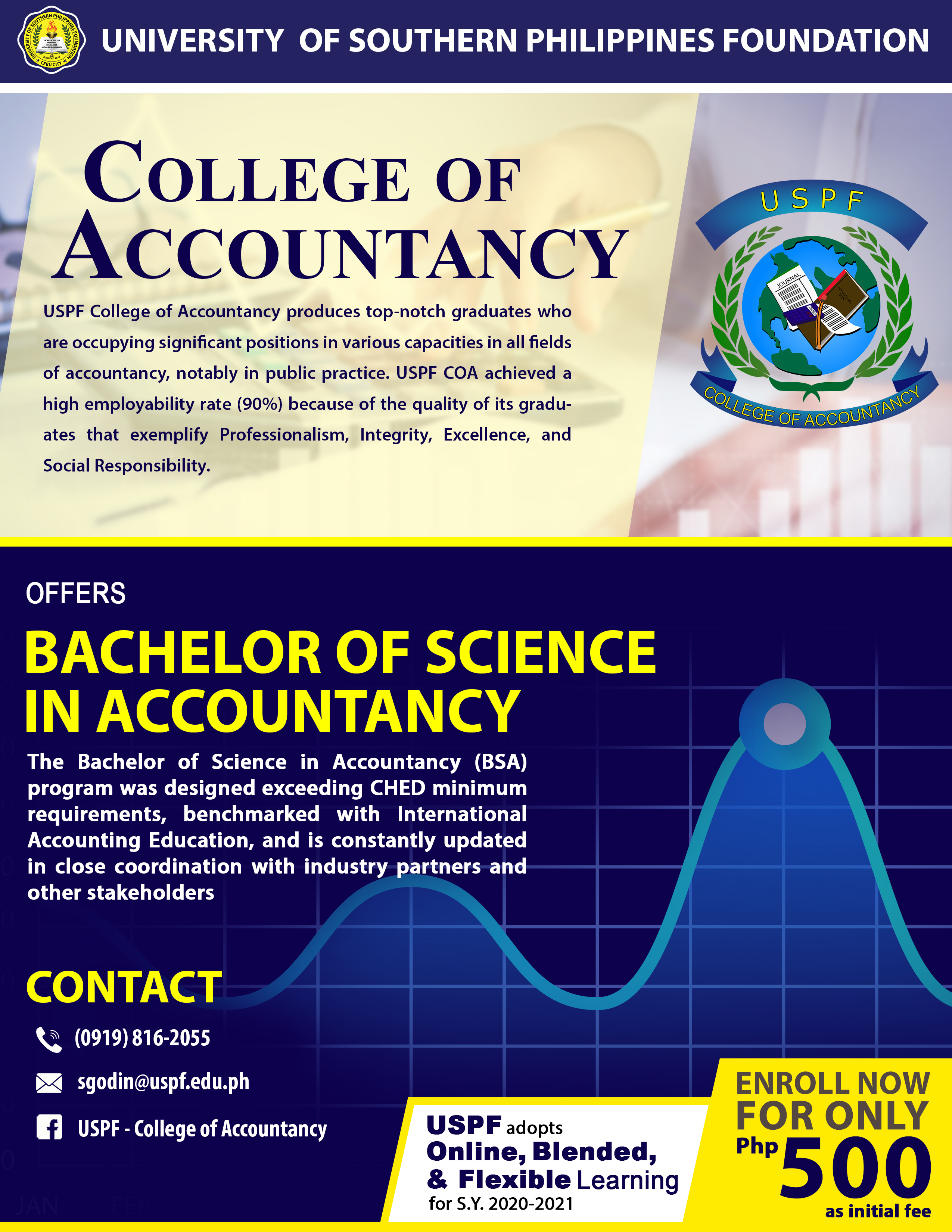 The USPF College of Accountancy has a pool of highly qualified Accounting teachers with varying fields of expertise and undying passion to share knowledge with their students and others. The Bachelor of Science in Accountancy (BSA) program was designed exceeding CHED minimum requirements, benchmarked with International Accounting Education, and is constantly updated in close coordination with industry partners and other stakeholders